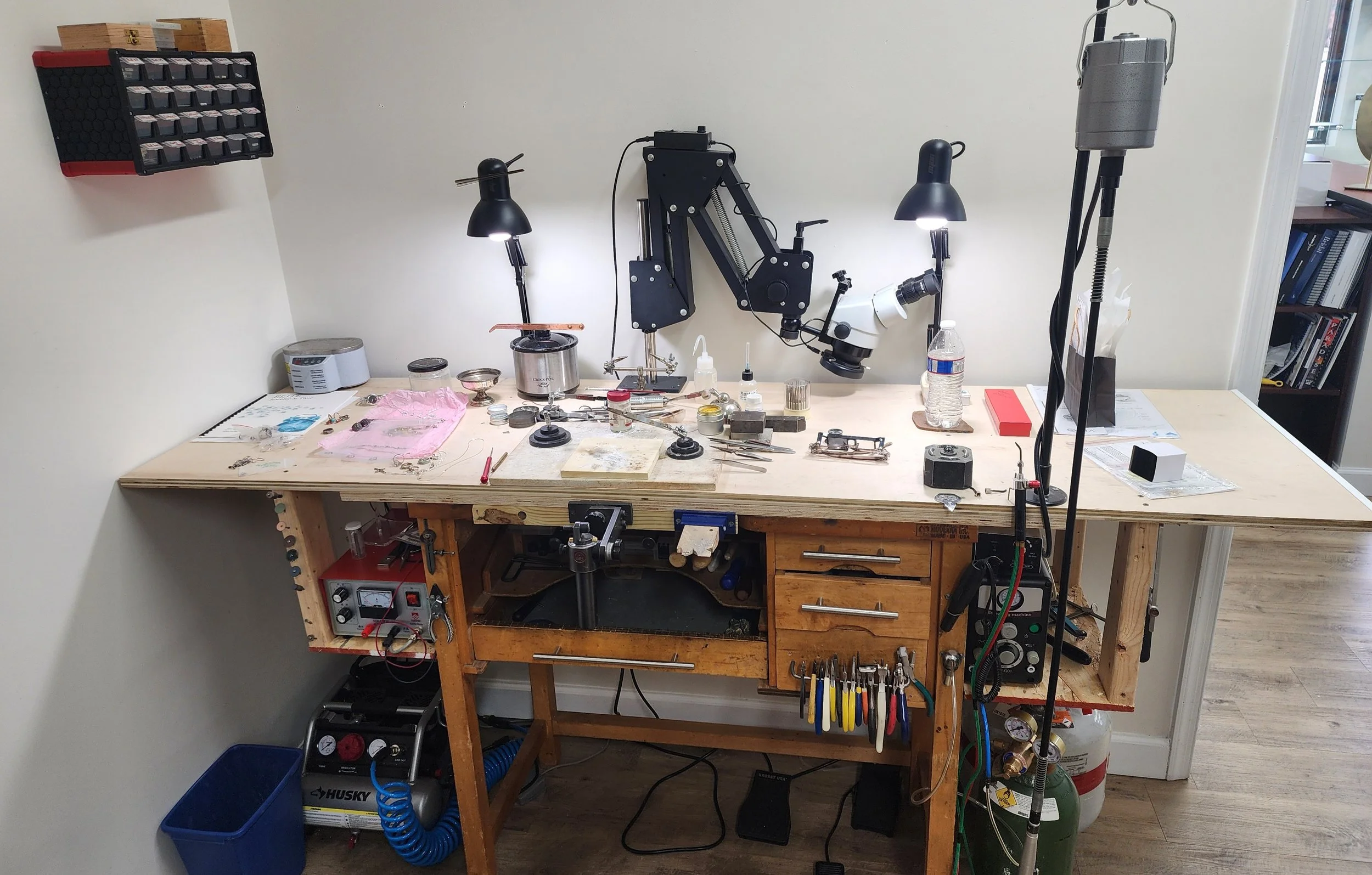 Our Jewelers’ Benches are state-of-the-art, with a range of specialized hand tools, gravers, holding tools, articulated microscopes, Orion pulse-arc welding unit, GRS pneumatic graver, Bench-Mates with accessories, Oxy/Propane and Hydrogen/Oxygen torches, Micromotors, Flexible shaft rotary tools, GRS ball vise, and many custom-made tools.