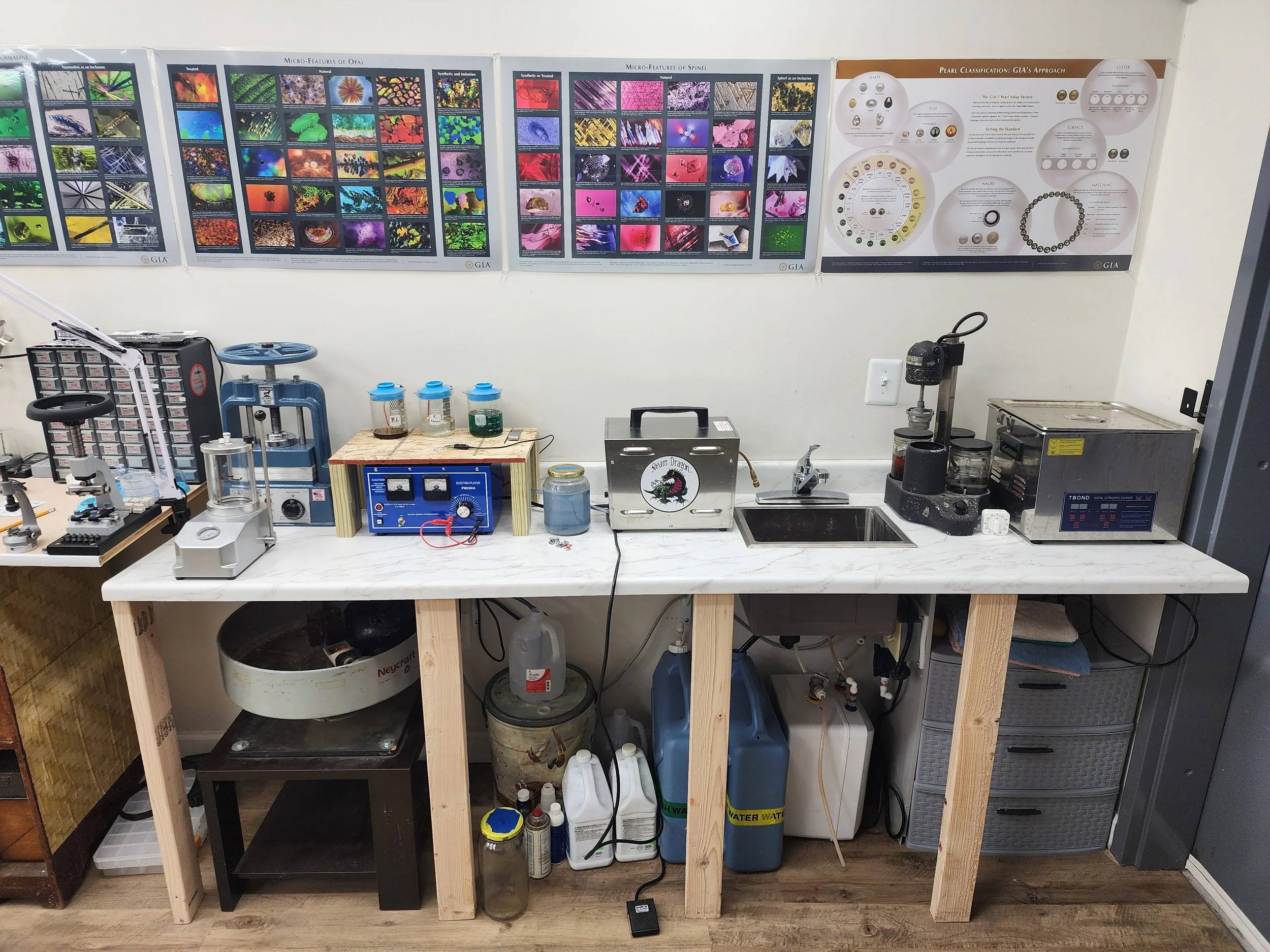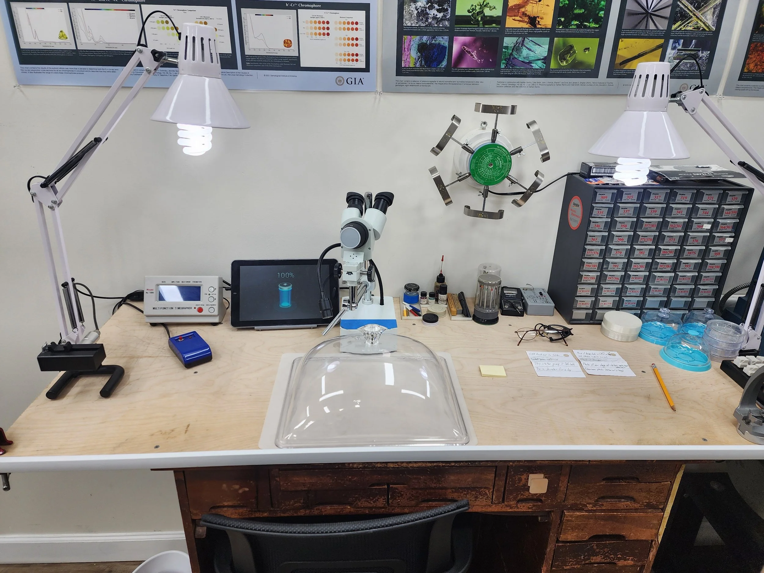 Our gemology work stations are stocked with all of the industry standard equipment, plus several advanced pieces of technology that put us ahead of many other labs, to include an X-Ray machine, UV-VIS-NIR Spectrometer, Raman microscope in 532nm and 785nm wavelengths, High powered trinocular biological microscope, Binocular gemological microscope with all accessories, Immersion cells, ASET light performance device, Polariscopes, Digital stone cut grade evaluation software, Dichroscopes, Spectroscopes, Precision weight scales and measuring devices, Hydrostatic specific gravity tool, Long and short wave Ultraviolet light box, Lab grown diamond rapid screening tool, large color grading light box with GIA master diamond color set, and more.