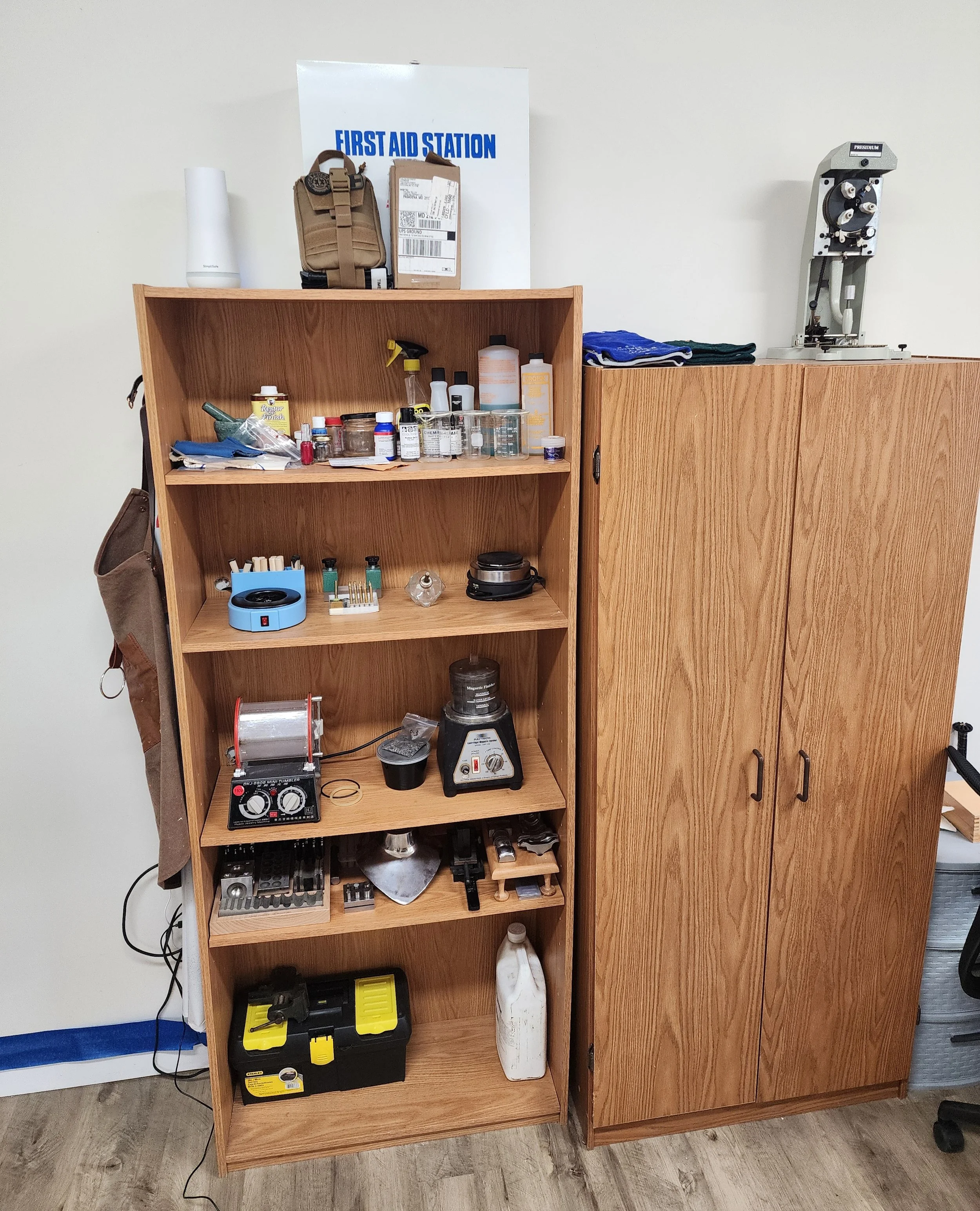 This general work station serves as a bridge point for many types of work flow, from 3d printing to setting stones in wax for cast-in-place techniques, to enameling, wax carving, stone treatments, and light electronics repair.